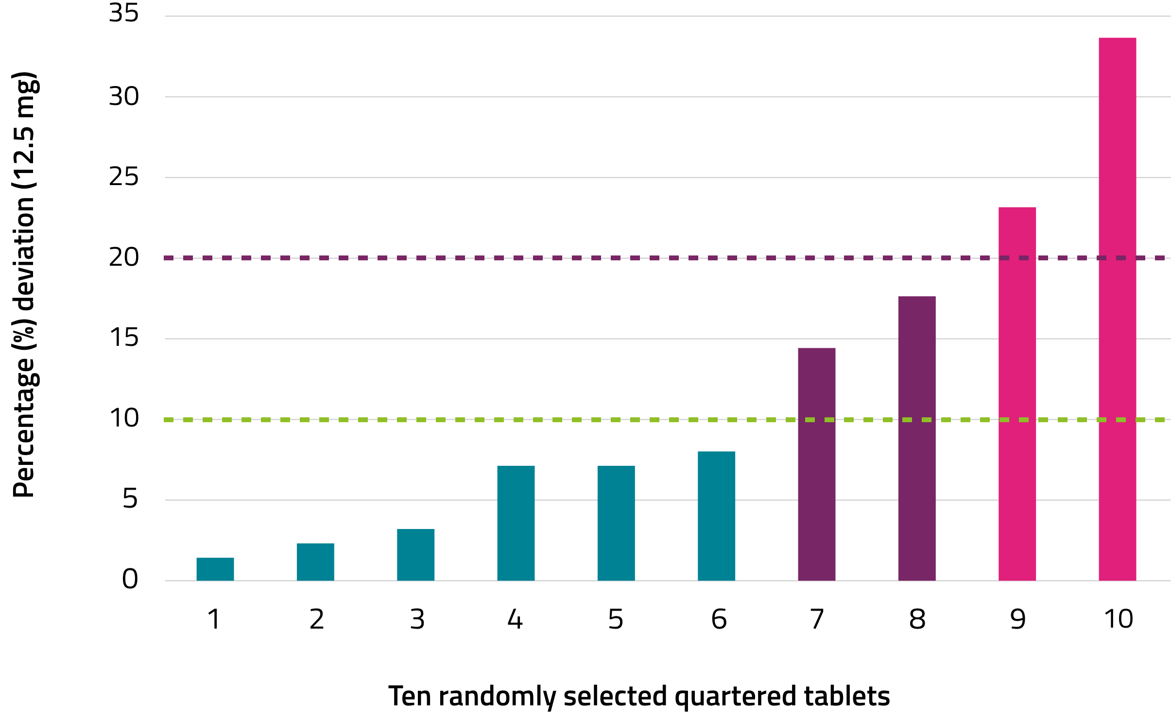 • Drug content variation in quartered tablets shown to be attributable to weight variation during the splitting process