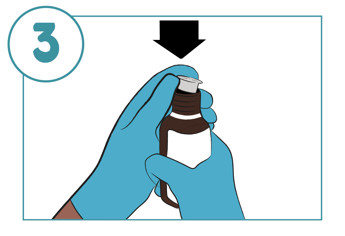 Remove the bottle cap and push the adaptor firmly into the top of the bottle. Leave in place for future doses